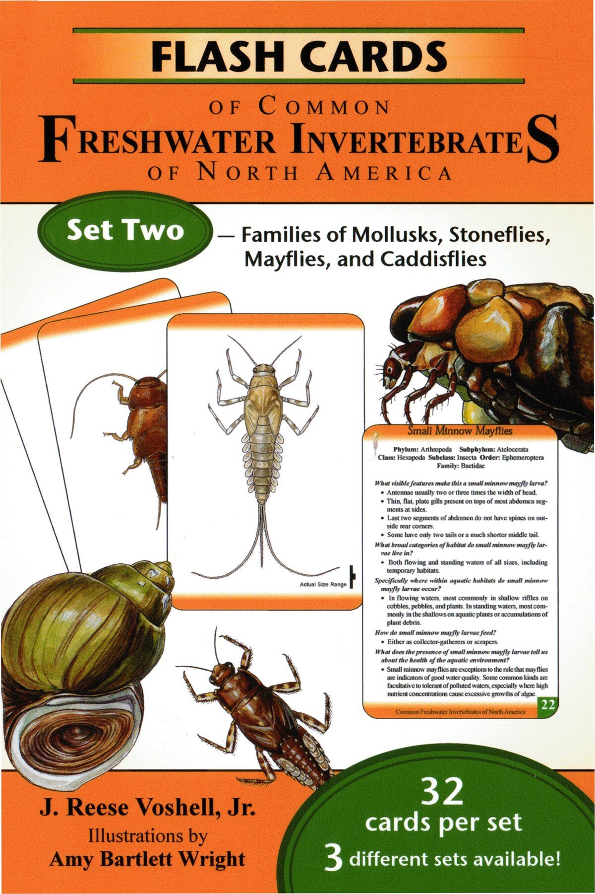 Each individual two-sided card features an original high-quality color scientific illustration of an organism on one side and, on the other, the common and scientific name of the organism along with basic questions and answers about the biology, ecology, and environmental tolerances of the pictured organism. In addition to the flash cards, a booklet containing diagrams of body parts, taxonomic classifications, a glossary of 52 terms used in text on the cards, and suggestions for using the cards will accompany each set. These products are based upon illustrations and information contained in J. Reese Voshell's highly esteemed book A Guide to Common Freshwater Invertebrates of North America, although they have been updated to include the most recent and pertinent information on the adaptations and functions of freshwater invertebrates in natural ecosystems and how the organisms respond to environmental stresses created by humans.